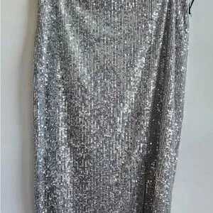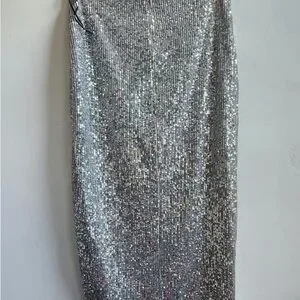 Shimmering silver sequin skirt perfect for evening events. Smooth silhouette with full sequin coverage for a dazzling look. Versatile styling for parties and special occasions. Eye-catching silver finish that catches the light.