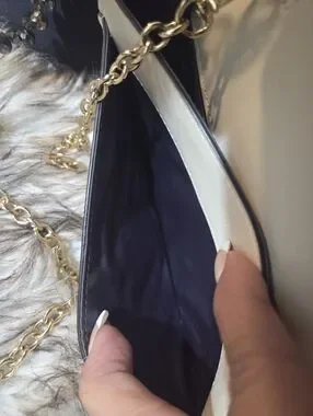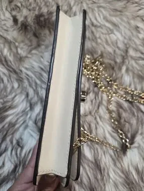 Cream leather clutch with a polished gold turn-lock closure. Smooth finish with neat edge stitching. Slim and elegant for daytime or evening use. Could be worn as a clutch or a shoulder bag with the golden strap that tucks in discretely.