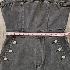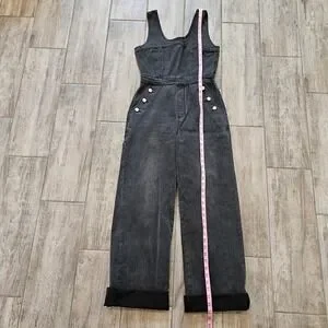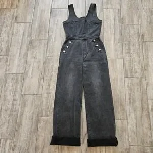 Acid wash denim jumpsuit features a structured sleeveless bodice with a scoop neckline and a full-length back zipper closure. The wide-leg silhouette is accented by decorative silver-tone buttons along the front pockets and classic patch pockets at the rear. Crafted from a faded black denim with a hint of stretch, this one-piece offers a vintage-inspired aesthetic with a modern fit.