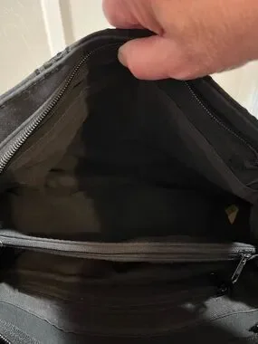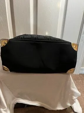 Stylish black monogram tote bag with gold-tone hardware and multiple compartments. Features a structured shape, zip closures, and shoulder straps for everyday use.