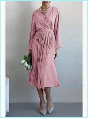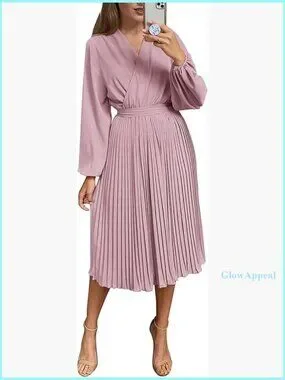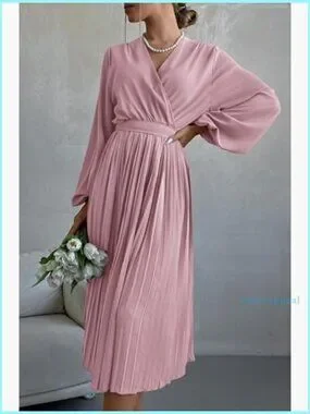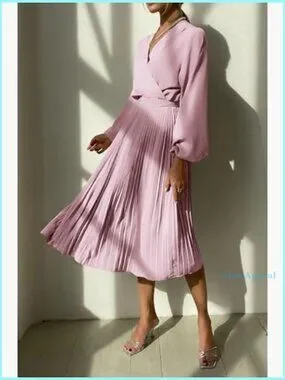 Midi Dress Long Puff Sleeve Wrap V Neck Flowy Ruffle Pleated Casual