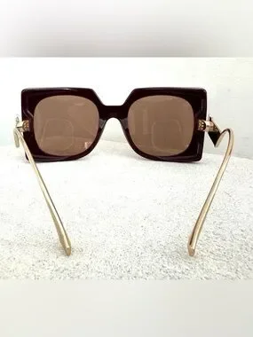 Bold, fashion-forward Etro sunglasses with an oversized square silhouette and signature Pegasus hardware at the sides. Rich burgundy frame paired with sleek gold-tone arms gives these a strong luxury statement look. New and unworn.