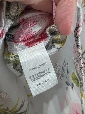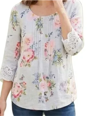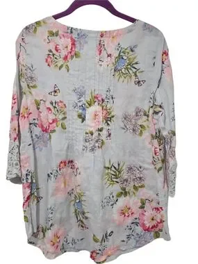 Scoop neck tunic with pintuck front detail. Soft white base with pink and blue floral print. Three-quarter sleeves finished with crochet lace trim. Relaxed, easy silhouette for everyday wear. Worn once and is in excellent condition, no holes, rips, stains or tears. Fits true to size. 100% Linen.