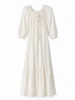 Beautiful cream maxi dress made from 100% cotton — lightweight, breathable, and perfect for warm weather. Features a relaxed boho silhouette with a gathered neckline, adjustable tie detail, and soft tiered skirt for a flowy, feminine look.
