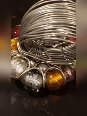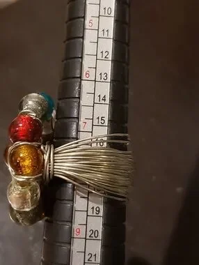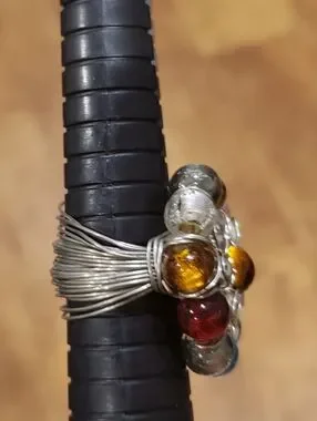 Bold cluster ring with mixed glass beads. Features amber, red, teal, green, silver and clear tones. Eye-catching and vibrant piece. Perfect for layering or as a standout accessory. Silver-tone wire wrapped band.