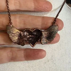 It’s sort of an aged copper tone metal with clear crystals in a pave setting the LOVE in the center of the heart. The wings are really details and almost look 3D.