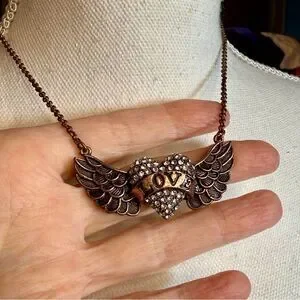 BETSEY JOHNSON WINGED HEART NECKLACE “LOVE” SPELLOUT COPPER CRYSTAL PAVE 18” EUC