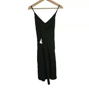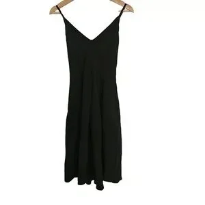 Elegant black spaghetti strap dress with a flattering V-neck. Lightweight drape and a streamlined silhouette for versatile wear. Perfect for evening events or layered styling.