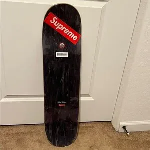 Official Supreme deck featuring a black woodgrain surface. Prominent red Supreme logo on top. Clean, minimalist graphic for display or build. Classic skateboarding aesthetic.