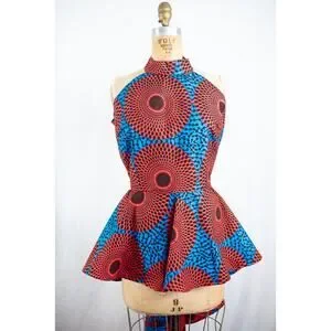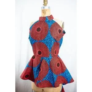 Beautiful African/Ankara print boutique dress by 'Lunik & Yan Couture'. This sleeveless dress features a high neckline with a nipped waist and mini-skirt in the front, which tapers to a longer skirt in the back.