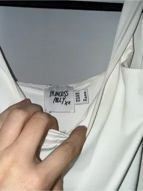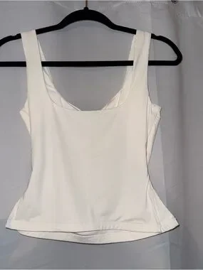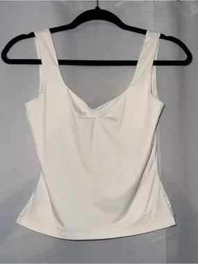 Sleek white tank with a soft drape. V-neckline with subtle gathered detail at center. Smooth, lightweight fabric for easy layering. Minimal, modern silhouette.