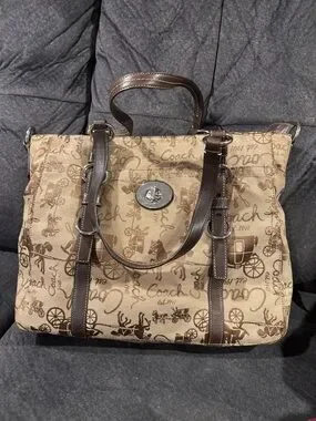Coach tote featuring signature script and carriage motifs. Tan canvas body with rich brown leather straps and trim. Center silver turn-lock clasp. Roomy interior for daily essentials.