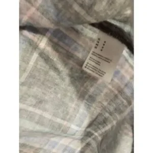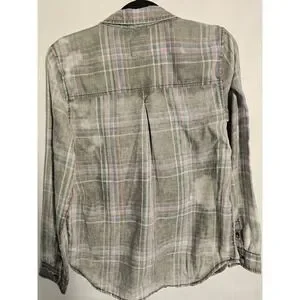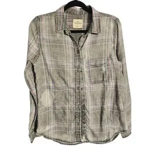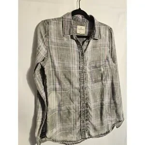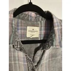 Discover effortless weekend style with this American Eagle Outfitters plaid button-down shirt. Soft and comfortable, this boyfriend fit shirt features a faded gray base with delicate pink and blue plaid accents creating a subtly washed-out look. The classic button-down silhouette is enhanced with a chest pocket and a relaxed fit, perfect for layering or wearing on its own. .