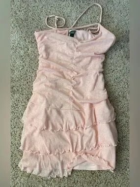 Soft light pink sundress with ruched bodice. Thin adjustable straps and layered ruffle skirt. Feminine, casual style for everyday wear. Worn only once!