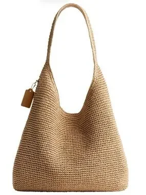 Coach woven shoulder bag in a relaxed hobo shape. Prominent tonal COACH logo across the front. Features a leather hang tag and single shoulder strap. Casual, breezy style for everyday wear.