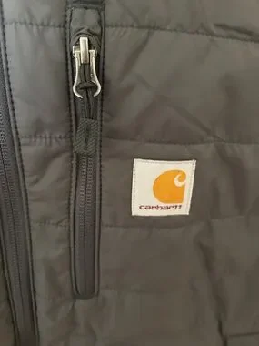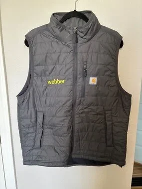 Carhartt Dark Gray Quilted Rain Defender Vest with Gold Webber Lettering