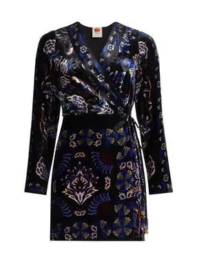 Crafted of velvet, this Arabesque Mix Scarves wrap minidress from Farm Rio showcases a floral print.