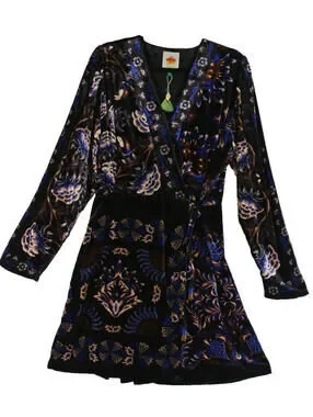 New, Farm Rio Arabesque Mix Scarves Floral Velvet Wrap Minidress Sz L