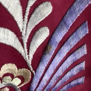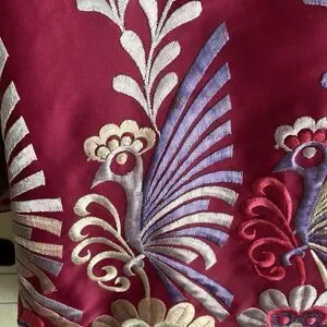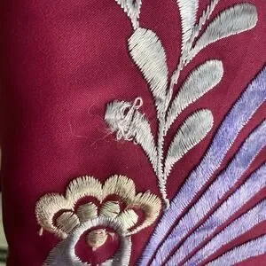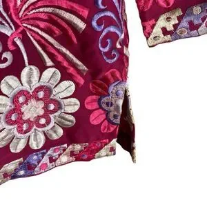 Deep pink with flower and birds embroidered on the front, back and sleeves