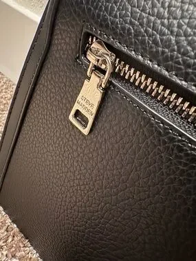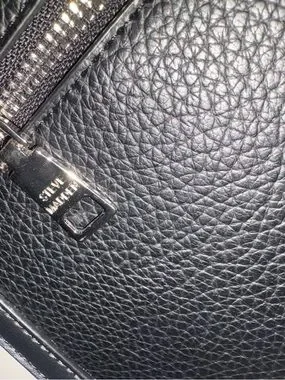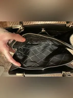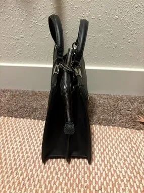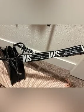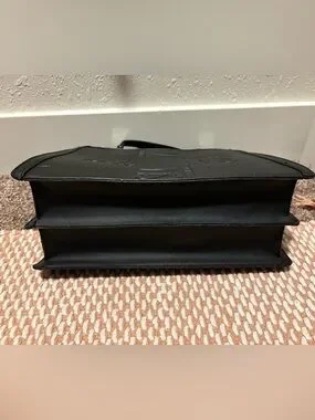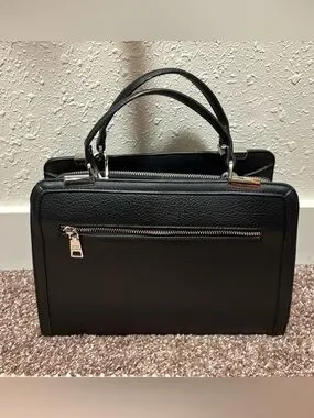 Structured top-handle purse with embossed SM logo pattern. Smooth faux leather finish with subtle sheen. Polished metal hardware accents. Sleek design for work or travel. Multi pockets with zipper and bottom closures, optional long handle in black and white with SM logo