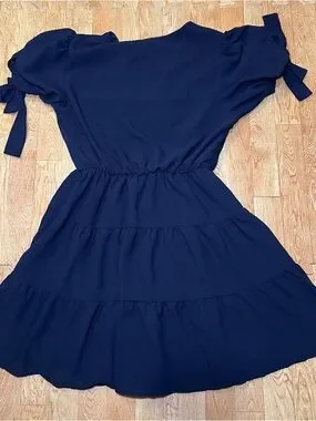 Altar'd State Navy V-Neck Tiered Mini Dress with Puff Sleeves