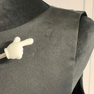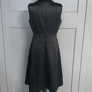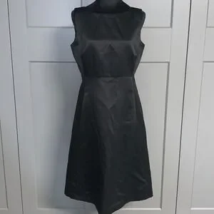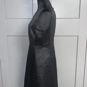 sleek silhouette defines this sophisticated black dress, perfect for making a statement at your next event. The dress features a high neckline and a flattering A-line skirt that falls to a midi length, creating a timeless and elegant look. Crafted with attention to detail, the dress offers a comfortable fit and a smooth, luxurious feel. Note the minor flaws on the front of the dress. Ideal for cocktail parties, business events, or a chic dinner date, this dress will ensure you stand out with effortless style.