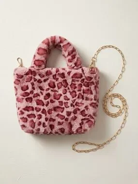 Soft faux-fur mini tote with a dusty rose leopard print. Features padded top handles and a removable gold chain strap for crossbody wear. Chic, plush texture adds a playful, feminine touch to any outfit.