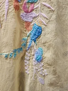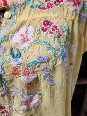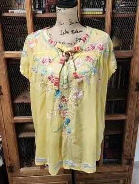 Offers welcome on this lovely yellow, NWOT, size XL, 100% rayon, embroidered tie and button neck tunic top by Johnny Was. Gorgeous multicolored embroidery on front, back yoke, sleeves and shirt tail hem. Truest representation of color is in the picture with the size tag. Approximate measurements: