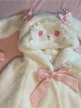 This button-up coat is a OS (one size) item. The bust measures approx 105cm. The leg warmers are stretchy on top and are OSFM. It's a sherpa-like material on the outside and lined with soft fleece-like material inside. It also comes with 8 detachable pink bow pins (two for the ears on the hood, four for the ears on the leg warmers, one large for the top of the front closure, and one extra). The faces are embroidered! I will not separate the set, please do not ask.
