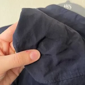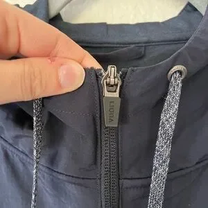 In good condition- small white marks on hood and right front shoulder- seems like they could be removed in washer but can’t 100% guarantee. Few small loose strings that don’t affect quality of jacket. Small pin size hole on inside coat hanger fabric loop- can’t see from outside. No rips or tears.