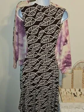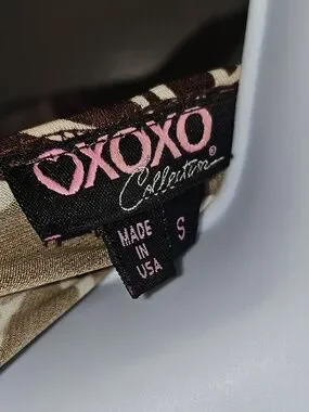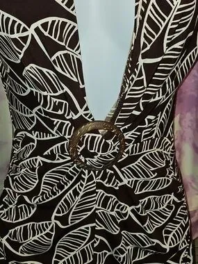 Sleeveless dress with bold brown and cream leaf print. Deep V neckline with cinched waist and decorative buckle. Sleek, graphic look. Versatile and stylish.