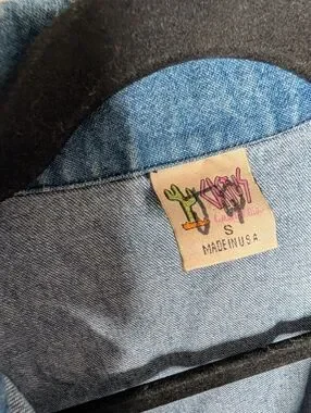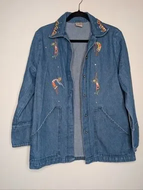 Super unique vintage denim jacket featuring colorful embroidered Kokopelli figures with Southwest-inspired detailing 🌵✨