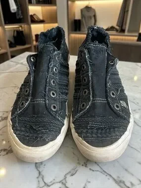 Casual women's slip-on sneakers in black with distressed frayed detailing. Elasticized entry for easy on-and-off wear and a snug fit. Contrasting white rubber sole provides everyday traction and a laid-back look. Versatile black sneakers for weekend and casual outfits.