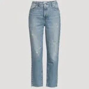 The Weekender jeans have a high-rise fit with a looser leg and drop-crotch fit. Crafted of cotton with a hint of stretch, they feature light distressing throughout and a raw-edge hem with light fray.