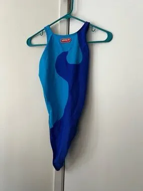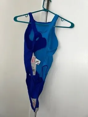 Sporty high-neck one-piece with eye-catching two-tone blue panels. Sleek, streamlined fit for active swimming. Simple, modern color-block design.