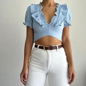 Super cute cottage top with a plunging neckline, ruffled detailing and tie back.
