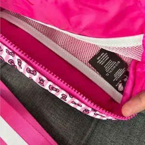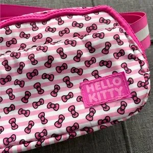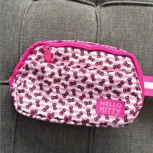 Charming Hello Kitty crossbody bag for kids. Features a vibrant pink and white design with iconic patterns. Ideal for carrying small essentials. Back zipper pull broke. Other zippers are good