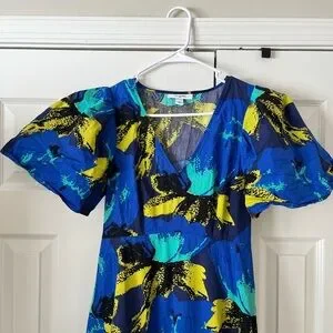 Statement maxi dress by Christopher John Rogers, known for bold color and modern silhouettes. Features a vibrant abstract floral print in cobalt blue, teal, yellow, and black. Designed with a flattering V-neckline, short puff sleeves, defined waist seam, and a dramatic tiered skirt for beautiful movement.