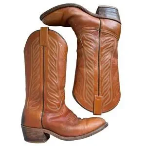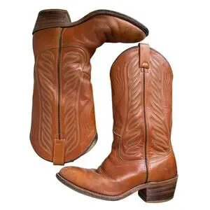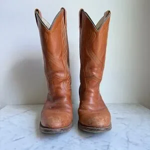 Vintage Knapp brown leather western boots with classic stitched shaft detailing and a low stacked heel. Smooth leather uppers with a well-earned patina and authentic vintage character. These boots are nicely broken in and show intentional wear consistent with age.