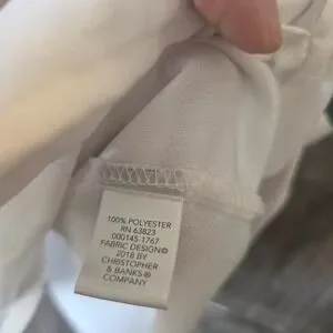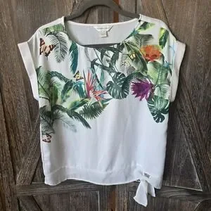 This Christopher & Banks shirt is a stylish and versatile option for women in size small. The white floral butterfly design adds a touch of spring and summer to the lightweight and stretchy rayon fabric. The pullover closure and crew neck make it easy to wear for various occasions from casual outings to parties. The polyester material ensures easy care with machine washability, while the tropical theme adds a fun and fashionable flair to this basic blouse.