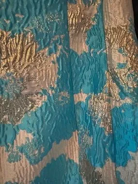 Eye-catching turquoise and gold mini dress with dramatic ruffle neckline. Textured fabric with metallic gold accents adds shimmer and depth. Flattering, structured silhouette perfect for evening events and parties.