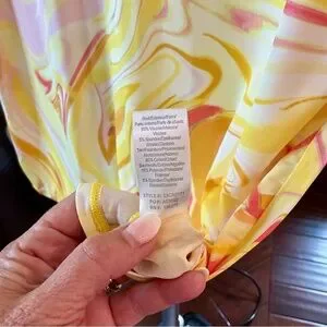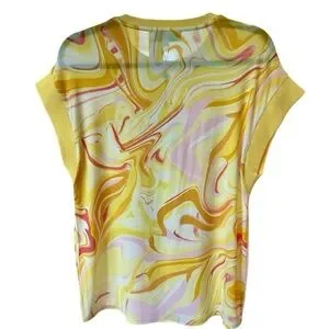 This Hale Bob viscose top features a vibrant yellow and orange graphic design, perfect for making a bold statement. The short sleeves and classic crew neck offer a comfortable and casual style, while the swirling patterns add a dynamic touch to your wardrobe.