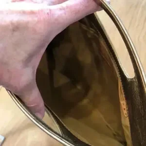 One side zipper inside. Measures 14” wide x 7” when folded and 14” tall when fully opened.