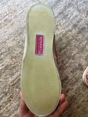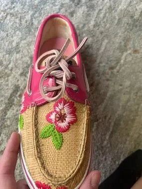 Vibrant pink boat shoes with floral embroidery. Canvas toe and patent leather sides. Lace-up slip-on style with cushioned insole. Playful floral accents and contrasting green leaf stitching. I wore these once. Some discoloration on inner heels and bottoms of the shoes otherwise great condition!