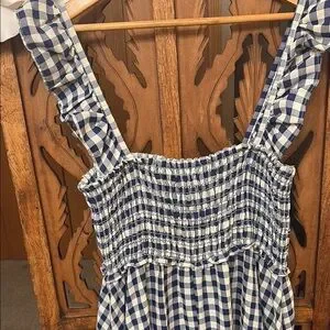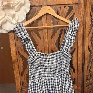Max Studio gingham maxi with smocked bodice and ruffle straps. Navy and white check pattern with a flouncy ruffle hem.