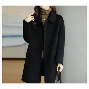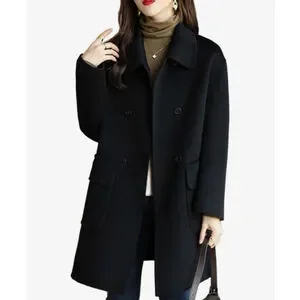 Classic winter wool look coat for women, featuring front double breasted button down placket, notch lapel, long sleeve with drop shoulder, 2 pockets, Mid-thigh length.