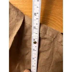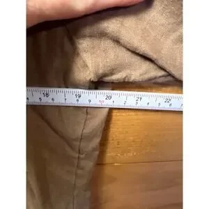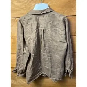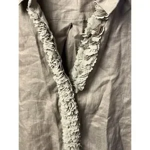 Chico's linen blend button down shirt with a charming ruffle trim along the front placket. This versatile top features a collared neckline, long sleeves with button cuffs, and a relaxed fit. Its neutral taupe color makes it easy to pair with various bottoms for a polished look. Perfect for casual outings, office wear, or a relaxed weekend brunch.