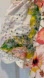 Off-shoulder mini dress with elastic neckline. White base with pink floral print and green leaves. Eyelet scalloped sleeves and hem. Lightweight and breezy for warm weather.