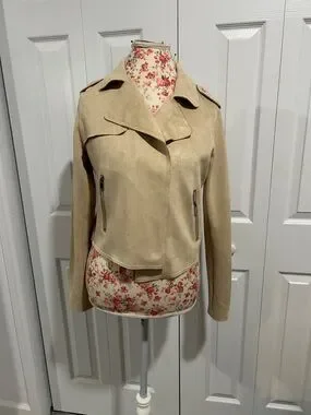 A tailored suede moto jacket in a neutral beige shade. Features an asymmetrical front and zippered pockets for a streamlined look. Lightweight and versatile for layering over casual or dressy outfits. Beige color provides a soft, elegant finish.