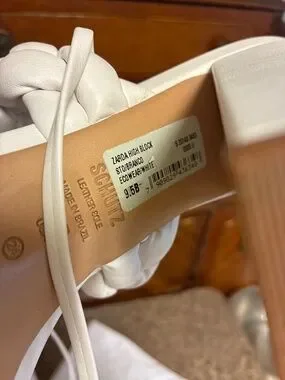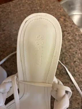 Size 9.5 white high block heel sandal with braided front also tie string including a dust bag in great condition